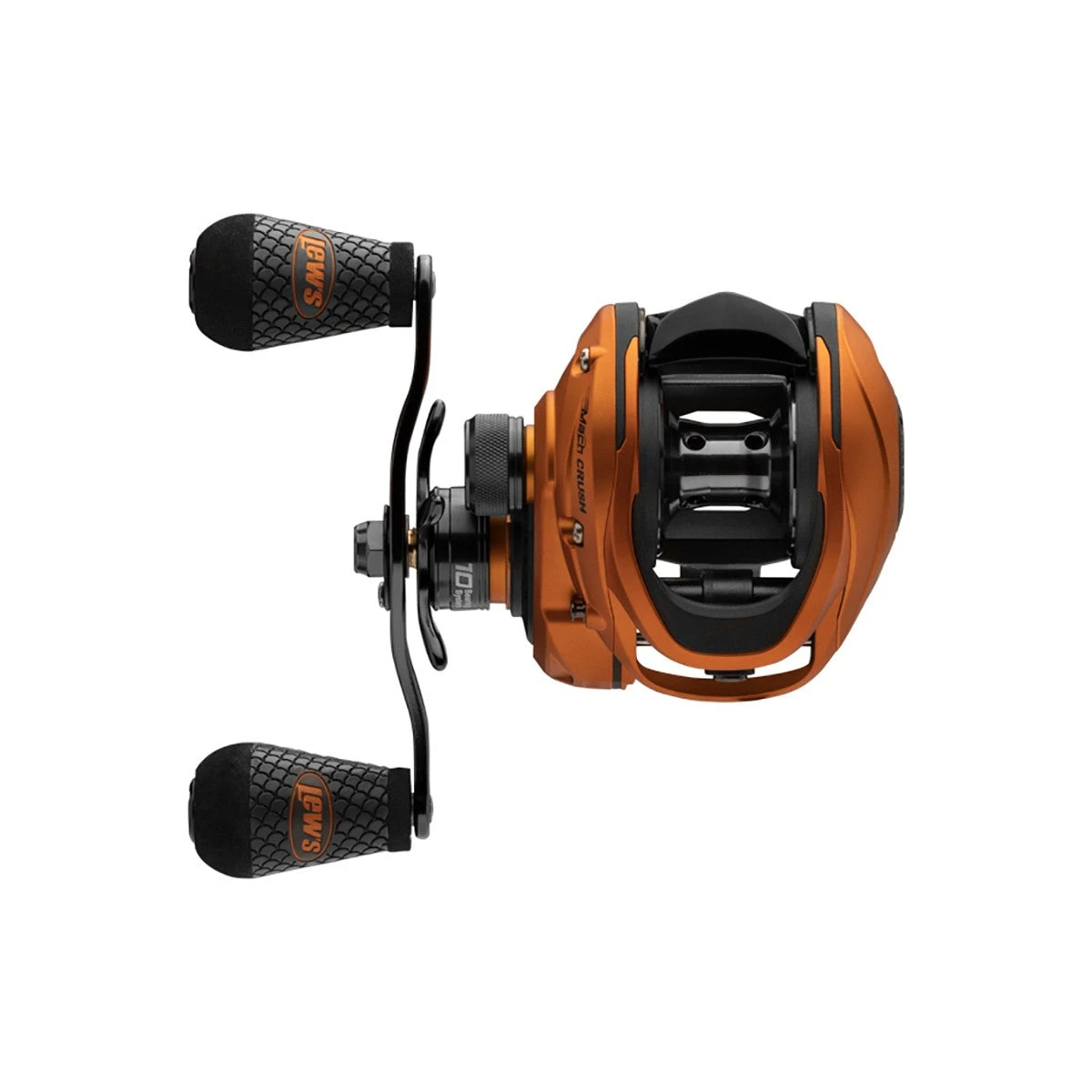 Mach Crush SLP baitcasting reels feature a high speed 7.5:1 gear ratio, available in left and right hand retrieves. Finished with a rich glow orange paint scheme, with a laundry list of features; strong and lightweight, graphite frame and sideplates, machined and anodized aluminum U-shape 32mm spool, high strength solid brass Speed Gears®, a premium 10 bearing system with double-shielded stainless-steel ball bearings and Zero Reverse® one-way clutch bearing, externally adjustable Multi-Setting Brake (MSB) dual cast control system utilizing both an external click-dial for setting the magnetic brake, plus 4 individually disengaging disk-mounted internal brake shoes that operate on centrifugal force, an anodized aluminum spool tension adjustment with audible click, a rugged carbon fiber drag system that provides up to 20lbs. of drag power, an anodized, bowed aluminum 95mm handle with Winn® Dri-Tac handle knobs, an anodized aluminum bowed drag star with audible click adjustment, with a locking pin sideplate, a Zirconia line guide and external lube port.